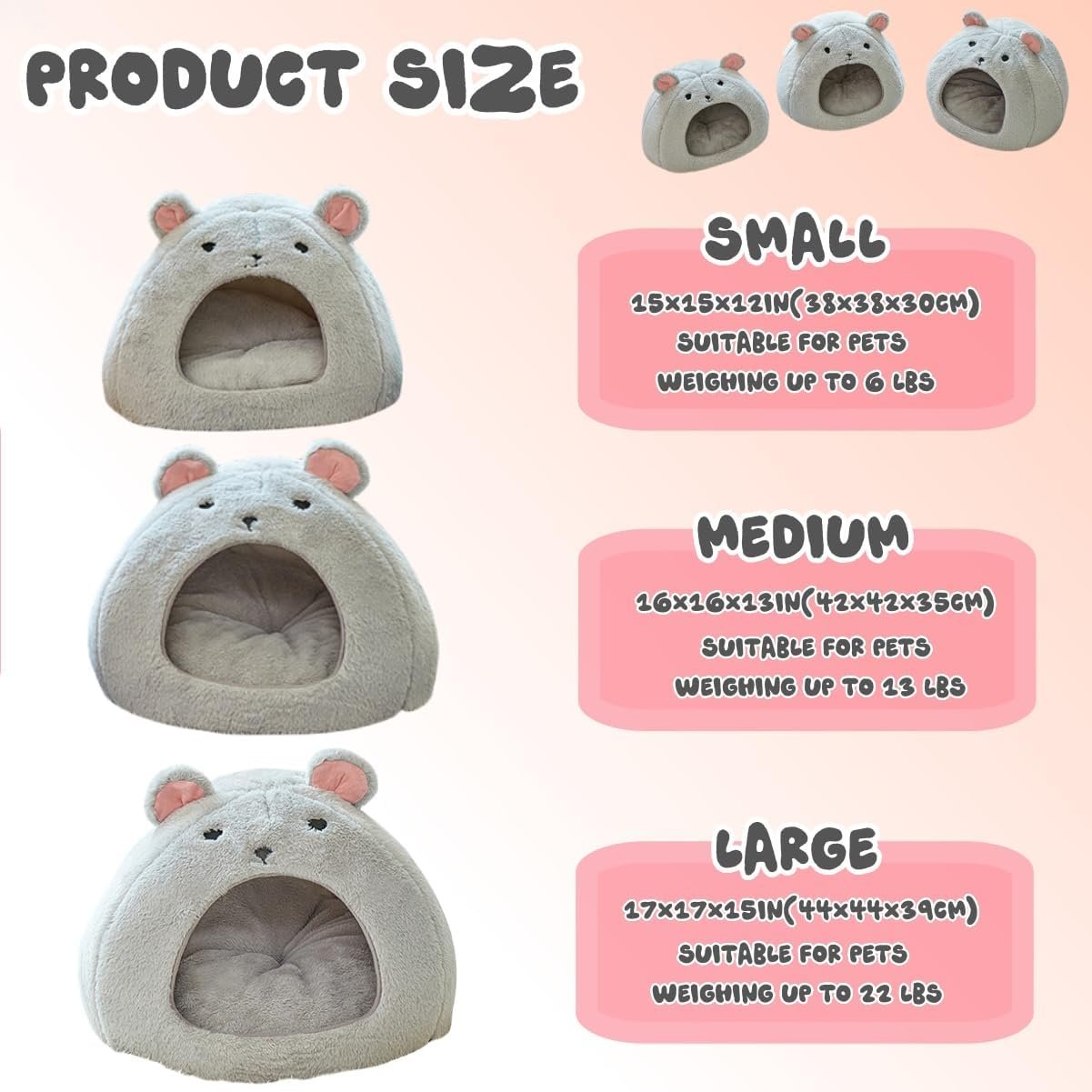 • 【Product size】:this cat bed product has the following dimensions: S: 15×15×12in(38×38×30cm), suitable for pets weighing up to 6 lbs. M: 16×16×13in(42×42×35cm), suitable for pets weighing up to 13 lbs.L:17×17×15in(44×44×39cm),suitable for pets weighing up to 22 lbs .Suitable for most-sized cats and small to medium-sized dogs
